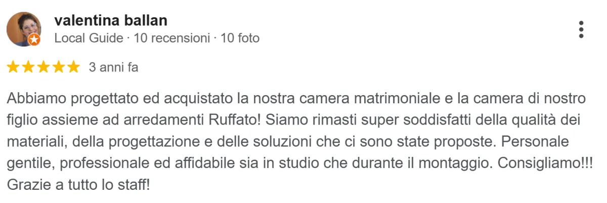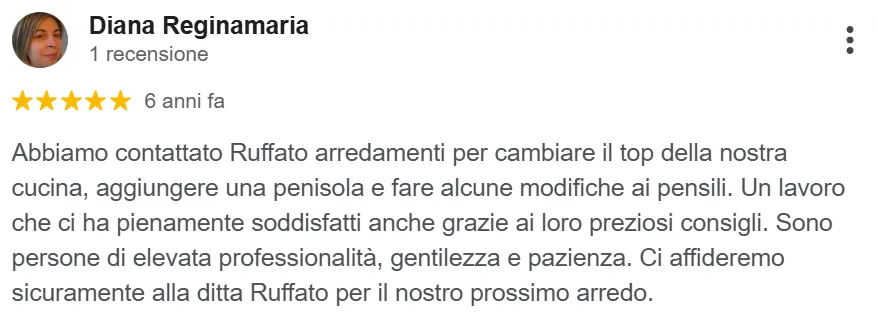“Abbiamo contattato Ruffato arredamenti per cambiare il top della nostra cucina, aggiungere una penisola e fare alcune modifiche… Un lavoro che ci ha pienamente soddisfatti”